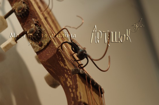 Натягиваются струны (я натянула четыре из шести, чтобы соблюсти "аутентичность" - на найденной гитаре было именно столько).